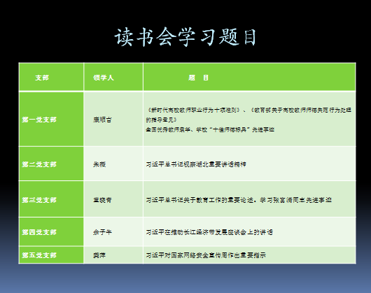 根据化工与材料工程系党总支《关于开展“不忘初心、牢记使命”主题教育的实施方案》,系党总支10月23日下午组织全体党员在3211开展“读书会”活动。![]() 围绕学习贯彻习近平新时代中国特色社会主义思想这条主线,各党支部书记重点领学“习近平总书记关于教育重要论述”及“习近平总书记在湖北的重要讲话精神”。 ![]() ![]() ![]() ![]() 本次“读书会”将理论学习和实践教育贯穿主题教育始终,原原本本学、集中研讨学、对照先进学、联系自身学,紧扣立德树人根本任务,就如何树立以师生为中心的发展理念,围绕系部中心工作,坚持为党育人、为国育才,提高人才培养质量等内容进行了研讨。 会后,全体教师党员重温了入党誓词。 ![]() (责任编辑:admin) |