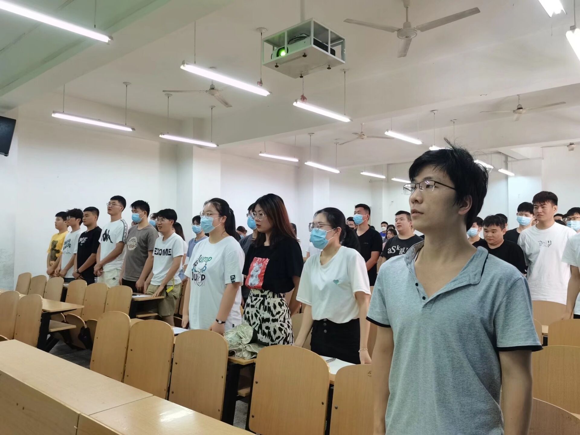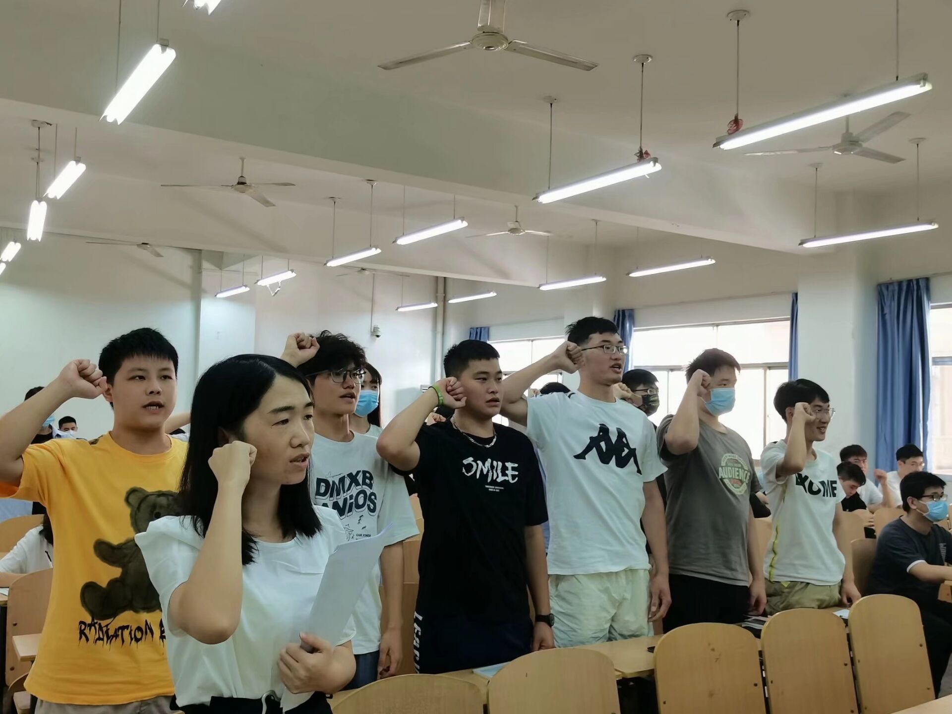 首先全体起立奏唱国歌,党员握拳宣誓。