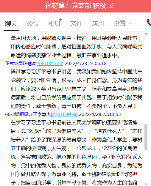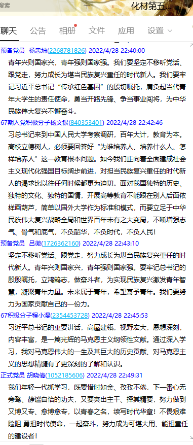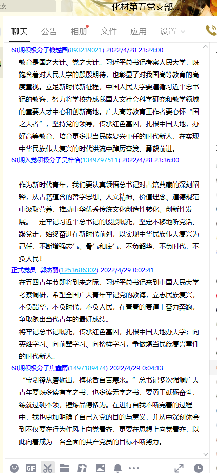 第五党支部书记郭咪咪老师带领学生支部成员学习2022年4月25日在中国人民大学考察时的讲话精神。习近平总书记指出:“要坚持党的领导,坚持马克思主义指导地位,坚持为党和人民事业服务,落实立德树人根本任务,传承红色基因,扎根中国大地办大学,走出一条建设中国特色、世界一流大学的新路。”这是习近平总书记对我国高等教育办学发展方向提出了进一步的要求。如今我们正向着全面建成社会主义现代化强国目标阔步前进,要立足于中华民族伟大复兴战略全局和世界百年未有之大变局,扎根于中国大地,为服务国家富强、民族复兴、人民幸福贡献力量,走出一条建设中国特色、世界一流大学的新路。这一切,都离不开坚持和加强党对高校的领导,这是办好中国高等教育的根本保证。高校落实立德树人根本任务,必须讲好思想政治理论课这个极其关键的课程,塑造好青年的价值观。深入学习、贯通领会习近平总书记对青年成长成才的一系列重要要求,青年要把对祖国的情感贯穿学业和事业的追求中,坚定理想信念,树立为党和人民事业不懈奋斗的抱负,心系人民群众,发扬斗争精神,不怕吃苦,在实践中砥砺成长。