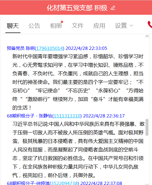 第四、五支部党员发表了学习体悟。学生党员陈明同学表示,新时代中国青年要增强学习紧迫感,珍惜韶华、珍惜学习时光,心无旁骛求知问学,在学习中增长知识、锤炼品格,不负青春、不负时代、不负重托,成就自己的人生理想,担当时代的神圣使命。我们要牢记:“不忘初心 牢记使命”、“不忘历史 永葆初心 方得始终”、“加油奋斗”才能有幸福美满的生活! ![]() 学生党员陈沄飞同学表示,在学习习总书记对人民大学考察时的发言时,有一句话令我印象深刻,那就是习总书记说:“中国青年的奋斗目标和前行方向归结到一点,就是坚定不移听党话、跟党走,努力成长为堪当民族复兴重任的时代新人”。我们现在作为大学生,这就是我们应该做的事,学校有学校发展的方向,学生也有学生发展方向,我们只有一起努力,才能不负总书记厚望,实现中华民族伟大复兴。 认真学习思政课,提升理论修养、夯实理论根基,做社会主义核心价值观地信仰者、传播者和践行者。不负韶华,不负时代,我们要在青春的赛道上奋力奔跑,坚定不移地听党话、跟党走,努力成长为民族复兴地时代新人。