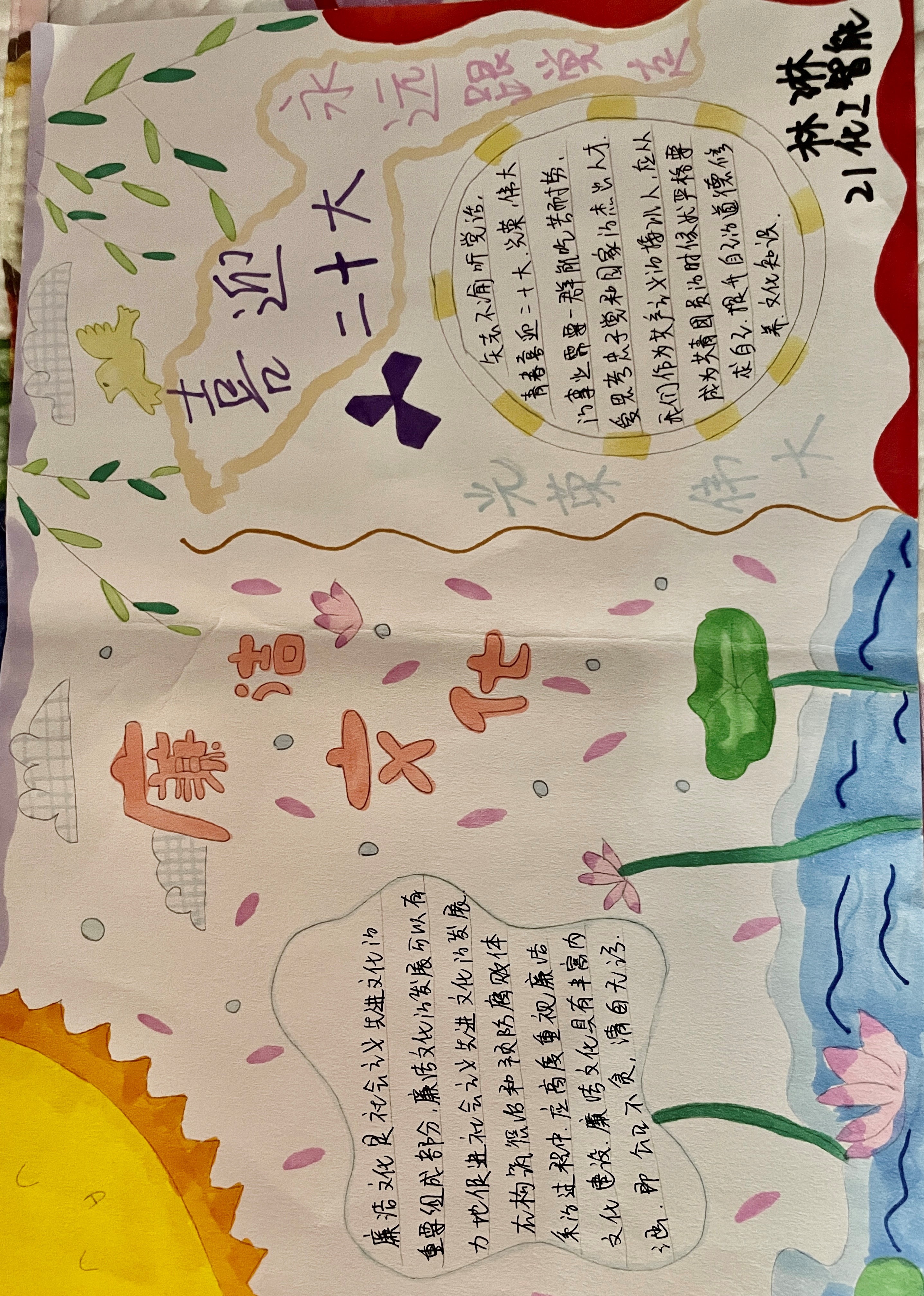 为喜迎二十大胜利召开,在9月份党风廉政建设活动月之际,为扎实推进化材学院党风廉政建设宣教月方案,教育和引导青年学生系好廉洁守正的“第一粒扣子”,化材学院党总支在9月份面对全院学生群体开展了“清廉秋风吹满地 化材青年扬正气”主题手抄报、书法作品征集活动。![]() ![]() ![]() ![]() ![]() ![]() ![]()