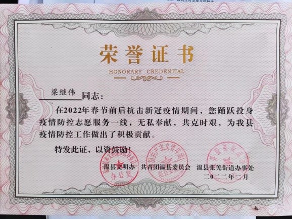 姓名:梁继伟 专业班级:19化学工程与工艺02班 志愿服务项目:疫情防控 服务地点:河南省焦作市温县南张羌街道常店村疫情防控点 主要事迹: 查看来往行人的健康码、行程码和社区码(指导未注册的村民/行人进行注册),登记来往货车车牌号,测量司机体温,并登记出发地、手机号、身份证号、进村目的等信息。 工作感悟: 每当国家有难,时代青年都会冲锋在前,引领潮流。我们作为新时代大学生,应当相应国家号召,扎根一线,勇于承担新时代赋予的新使命新责任。疫情防控责任重大,工作繁琐艰难,复杂情况较多。我是在农村,最大的感受就是不理解、不配合的村民较多,不少村民没有健康码,又不耐心去申领健康码,但疫情防控重于泰山,健康码、行程码和社区码在疫情防控工作中有极为重要的作用,只能耐心地做好解释和指导工作。另外,不少村民出门不戴口罩,我都要耐心劝导。而且处理问题的方法是很重要的,既要工作到位,又要谦虚礼貌,不冒犯长辈,这就是我最实际的感受吧。 ![]() ![]() |