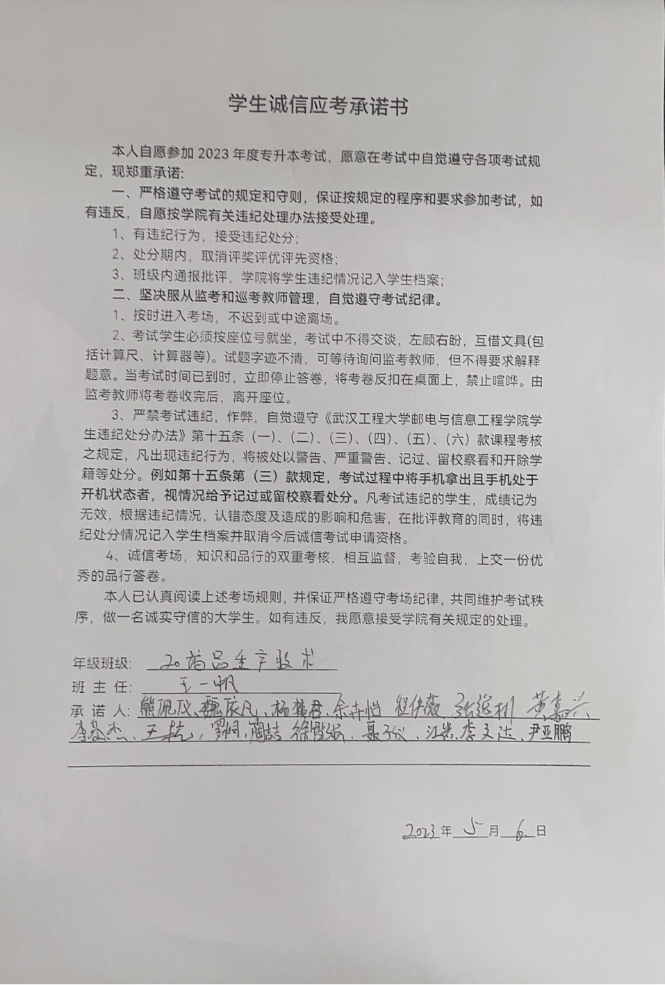 (通讯员:王一帆)2023年5月6日中午11:30304永利集团于3号教学楼3209教室举办了“认真复习备考 严肃考风考纪”的专升本教育主题班会。化材学院2020级药品生产技术全体学生参与了此次活动。 与诚信携手同行,与舞弊挥手作别。班会伊始,班主任王一帆带领全体同学学习《学生违规违纪处理办法》,学习考试作弊的相关条例,劝诫同学们端正考试态度。接下来,班主任向同学们强调了诚信的重要性,“人无信而不立”,诚信是每个大学生应有的道德基础坚决杜绝舞弊行为,教育同学们要做诚实守信的人,动员学生干部发挥模范带头作用,带领全体同学共同签署《诚信考试承诺书》,呼吁同学们抵制考试违纪的行为,端正态度,诚信考试。最后,王老师温馨提醒同学们定好闹钟,准时参加考试,提前打印并准备好准考证和身份证,提前祝愿同学们考试顺利,旗开得胜,取得优异的成绩。同学们纷纷表示,在此次专升本考试中,将会自觉遵守考场纪律,不会抱有侥幸心理,保证严于律己,做到诚信应考。 ![]() ![]() |