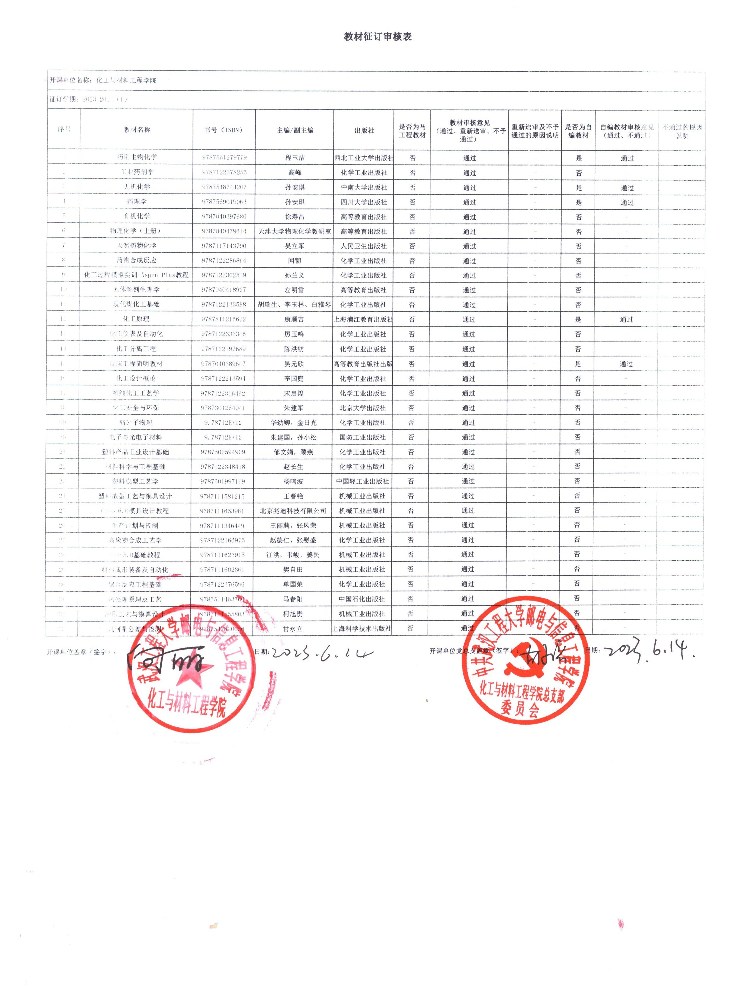 根据《永利集团304教材建设与管理办法(试行)》(院政发[2022]42号)文件要求,化材学院进行了2023-2024学年度第1学期征用教材审核。按《304永利集团教材选用审核方案》要求及工作流程,在以教研室为单位进行了初审的基础上,于2023年6月14日13:30化材学院教材审核小组进行了2023-2024学年度第1学期征用教材审核会议。![]() 本次通过的教材共33部,其中自编教材5部。基本选用国家和省级规划教材、精品教材、获得省部级以上奖励的优秀教材及同类高校公认公选的通用教材。教材均符合本校人才培养方案、教学计划和教学大纲要求,能做到因材施教,同一门课程只选用一部教材。选用的教材均思想观点正确,无政治性和政策性错误,符合教学规律和认知规律,富有启发性。但部分经典学科基础课程的教材存在版本较早,未能及时替换新版等问题,需任课教师们及时更新,与时俱进。 经化材教材审核小组论证后,结果公示如下: ![]() 304永利集团 2023年6月14日 (责任编辑:admin) |