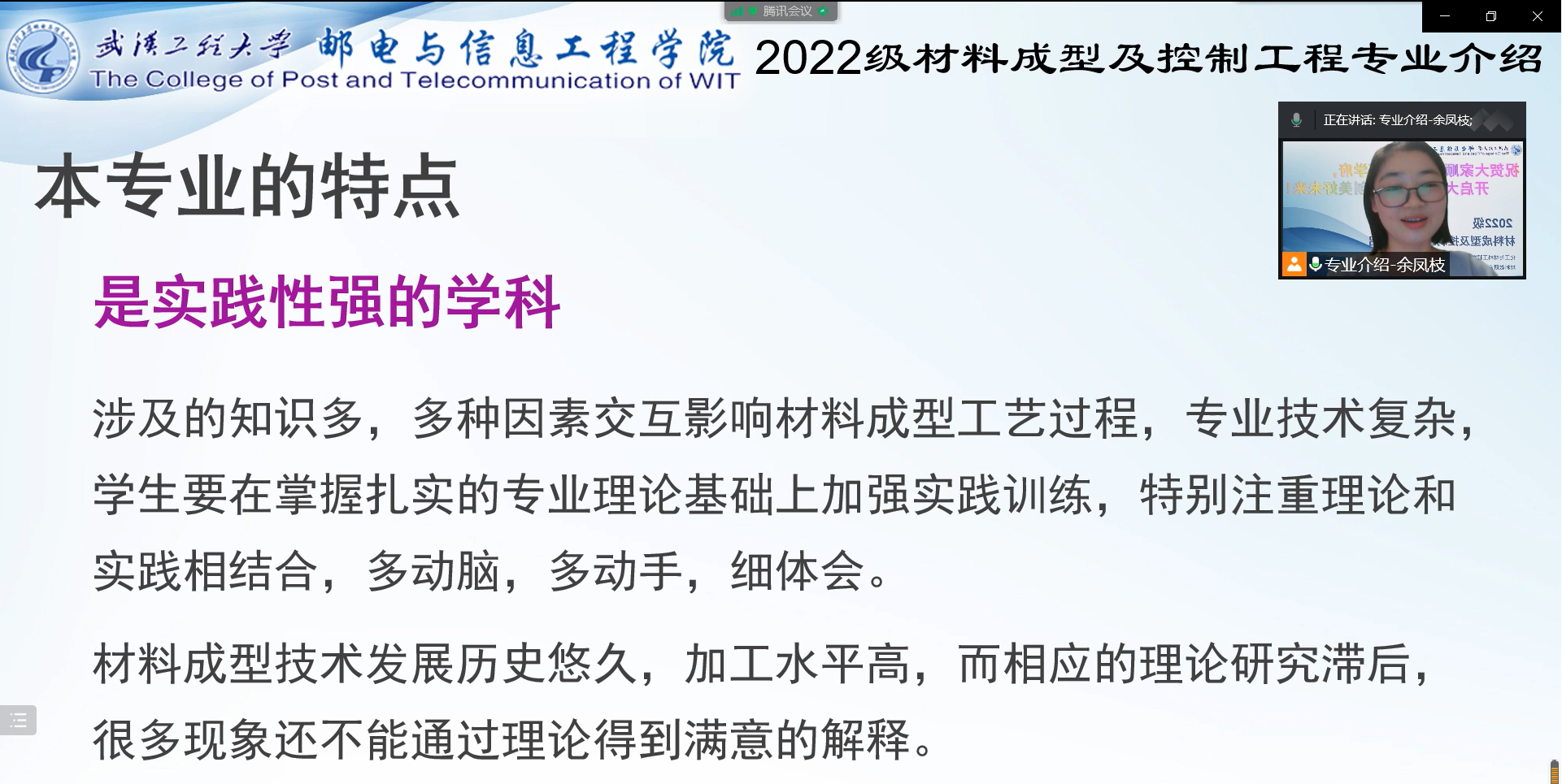 2022年9月21日至23日,304永利集团举办了2022级新生专业认知教育讲解活动,专业认知教育旨在帮助同学们深入了解自己将要学习的专业,此次活动由各专业课老师作为主讲人,各专业全体同学参加学习,7个专业班级错时开展学习。![]() 化材学院2022级新生专业认知教育安排统计表 9月21日下午通过腾讯会议材料成型专业教师余凤枝对2022级材料成型及控制工程专业开展了线上新生专业介绍活动。余凤枝老师对各位同学能够顺利进入高等学府表示了祝贺,欢迎广大学子共同开创美好未来。她围绕“你心目中的大学生活是怎样的?”、“你心目中的材料成型专业是怎样的?”以及学生和家长最关心的“这个专业地位如何?”、“这个专业如何学?”、“学这个专业未来如何?”等五个问题展开了意义介绍。通过大学的概念、大学的任务、大学生的使命以及大学生活的介绍,帮助学生更好地理解和规划大学生活,明白每一位大学生肩上的重任和为国为民服务的使命感。另外,余凤枝老师从专业名称出发,详细解释了材料成型专业的内涵和发展历程,介绍了我院本专业的研究内容、课程设置与依据、学习方法、专业前景以及学生就业与考研的方向等。最后,通过介绍本专业在生活及工程领域中的体现、模具对国家经济发展水平的重要性、本专业和国家强国战略的紧密联系、十九大报告和十四五规划中对实现制造强国的发展规划描述等,强调了本专业的核心地位,增强了学生对本专业重要性和发展的认知。 ![]() ![]() ![]() 材料成型与控制工程专业介绍截图集锦 9月22日上午,康顺吉老师对2022级化学工程与工艺(智能化工)新生进行了专业介绍。本次专业介绍主要针对2022级新生,对本专业的培养目标和方向、本专业特色、课程体系设置、校企合作实习实训基地建设、科技竞赛活动、大学生涯的成长规划和就业方向及岗位等内容进行了介绍。在专业介绍中重点介绍了湖北知名的化工企业,如湖北兴发集团、湖北三宁化工股份有限公司等优质企业,从企业概况、人才需求等方面对企业进行了展示,让学生了解本专业人才培养与企业人才需求的紧密联系,学生对化工企业从毫无认知到有一个初步的认识和了解,逐步建立对专业的认知和兴趣。专业介绍与学生的互动沟通过程中了解到,学生普遍关心的问题是大学将学习哪些课程、课程学习安排、如何适应大学学习生活、化工专业优势、就业方向、就业企业和考研情况等方面的内容。今后在专业介绍方面可从这几方面进行重点介绍,讲好新生入学第一课,引导学生正确认识本专业,更好的规划大学生活。 ![]() ![]() ![]() ![]() 化学工程与工艺智能化工方向专业介绍截图集锦 9月22日下午,化材院2022级制药工程新生专业介绍在腾讯会议上举行。本次专业介绍由孙安琪老师主讲,欧阳琼院长全称参与指导工作。介绍会上孙安琪老师对2022级新生的到来表示热烈欢迎,介绍了专业特色和课程概况,解答了新生在专业上的问题。各专业老师们详细地向新生介绍了专业的发展历程、就业前景和深造方向,耐心讲解了专业的知识体系、学习方法,以及考研的途径。 本次专业介绍搭建起老师与新生的沟通平台,满足了新生初入大学渴望了解学院、了解专业的强烈需求,减少新生对未来大学生活的不确定性,同时加深师生了解,拉近了师生的关系。 ![]() 制药工程专业介绍截图集锦 9月23日上午,药物制剂专业新生认真学习了由程玉洁老师主讲的专业认知教育课程。程玉洁老师以严谨细致的方式从“药物的发展史”“药剂的重要性”“学习药剂需要的基本素养”三个角度进行讲解,提出药物制剂专业的同学们应掌握本专业及相关学科基础,理论和专业知识、具有良好的创新意识和职业道德、具备制剂过程开发的能力、具备日程管理和质量管理能力、学会制剂工艺设计,生产技术进质量控制,同学们积极听取老师建议,受益匪浅。 ![]() ![]() ![]() 药物制剂专业介绍截图集锦 同时,瞿小兰老师在流芳校区线下与学生们面对面进行了制药工程专业专升本新生的专业认知教育。瞿老师主要从“制药工程专业的主要研究内容”“制药工程专业的培养目标”以及“制药工程专业的就业前景”三个方面进行详细的解说。通过讲解,新生们了解到,制药工程专业是一门以培养从事药品制造工程技术人才为目标的化学,药学和工程学交叉的学科,要求同学们掌握药品制造的基本理论、药品生产工艺流程等技能,学好制药则是为了将药品制造技术用于服务人民,为我国制药行业做出贡献。 ![]() 瞿小兰老师面对面与制药工程专业专升本新生交流 9月23日下午,安排了两场专业认知教育线上课堂。首先是魏端丽老师进行的高分子材料与工程专业介绍,她播放了304永利集团的宣传片,帮助新生了解304永利集团的专业组成、一流本科专业及一流本科课程、师资情况、校企合作情况、学科竞赛成果、考研情况和就业情况。她从高分子材料与工程专业、高分子材料与工程(光电信息材料方向)的专业解析、培养目标、本专业的培养要求、师资情况、人才培养模式和未来就业深造的前景等五个方面全面介绍了高材专业。魏端丽老师还介绍了本专业的就业前景以及学生考研的方向。帮助新生坚定专业信心,树立端正的学习态度,明确未来的学习方向和目标。 ![]() ![]() ![]() ![]() 高分子材料与