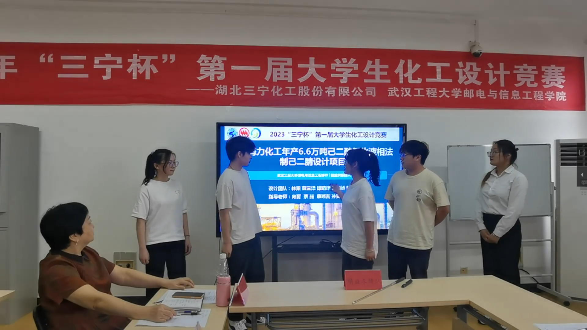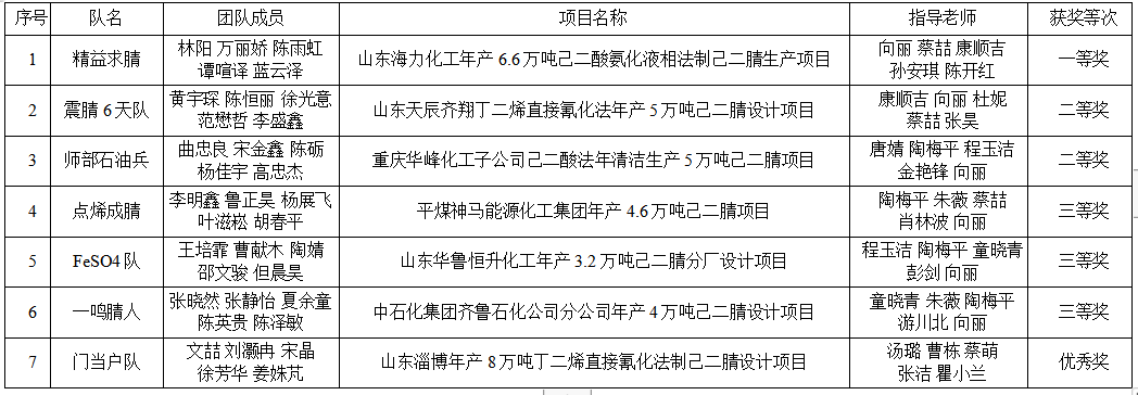 本次竞赛题目为某大型化工企业设计一座用于己二腈清洁生产的分厂,要求技术符合我国绿色低碳循环发展要求。经过三个月的作品打磨,共有7支队伍进入决赛的角逐,通过评委作品打分、作品汇报、现场答辩等环节,最终,评选出一等奖1项、二等奖2项、三等奖3项以及优秀奖1项。