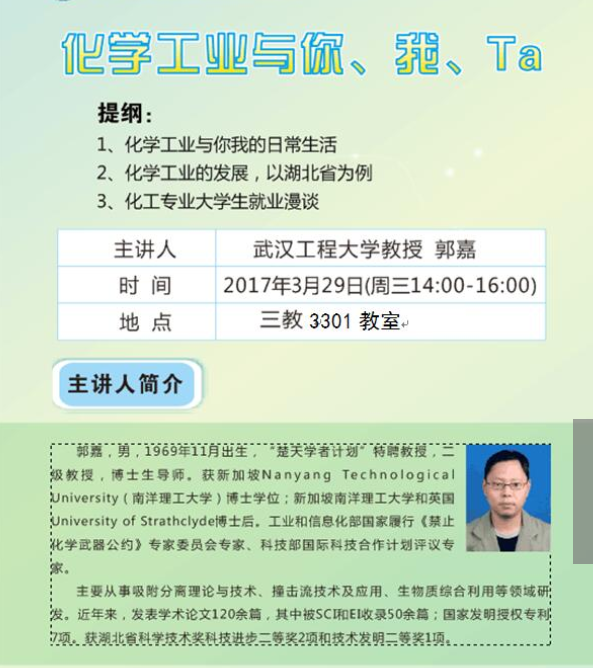 (通讯员:向丽) 2017年3月29日,武汉工程大学郭嘉教授应邀来化工与材料工程系与师生进行学术交流讲座,讲座主题为《化学工业与你、我、Ta》。本场讲座由化工与材料工程系系主任宣爱国主持,学院副院长欧阳琼开场致辞,化工与材料工程系全体教师、学院其他对化学工业感兴趣的教师与学生参加了本次学术交流活动。 本次学术活动中,郭教授通过“化学工业”的定义,阐述了化学工业与衣食住行用、与其他行业、与你我他的紧密关系。分析了我国化学工业的发展现状和存在的问题,介绍了湖北省的化学工业发展状况和化工类学生的就业前景。针对我院青年教师,郭教授从现代大学的职能出发,结合自身的经历和体会,立德树人,从紧跟学术前沿、结合科研实际和转变教学方式三个方面培养学生的创新意识和综合能力,分析如何争当一名合格的高校教师。针对在场的学生,从专业知识学习和综合能力培养方面帮助大学生进行学业和就业规划。 郭教授深入浅出,带领广大师生分析化学工业现状,了解化学工业的发展方向,拓展了在座师生的眼界。这场精彩纷呈的学术盛宴在师生们热烈的掌声中进入尾声。讲座结束后,化工与材料工程系系主任宣爱国邀请郭嘉教授与系骨干教师座谈,协商后续学术交流的可能性及实现途径。 ![]() ![]() 专家简介 郭嘉,男,1969年11月出生,博士,二级教授,湖北省“楚天学者”计划特聘教授,博士生导师。获新加坡Nanyang Technological University(南洋理工大学)博士学位;新加坡南洋理工大学和英国University of Strathclyde博士后。现为武汉工程大学化工与制药学院副院长、工业和信息化部国家《禁止化学武器公约》专家委员会专家、科技部国际科技合作计划评议专家。主要从事吸附分离理论与技术、撞击流技术及应用、生物质资源综合利用以及气态污染物控制等方面的研究工作。主持和参与多项科研课题;发表学术论文120余篇,其中SCI和EI收录50余篇;发表国家发明授权专利7项;获湖北省科学技术奖科技进步二等奖2项和技术发明二等奖1项。 ![]() |