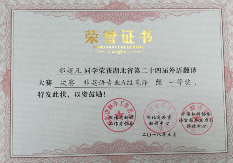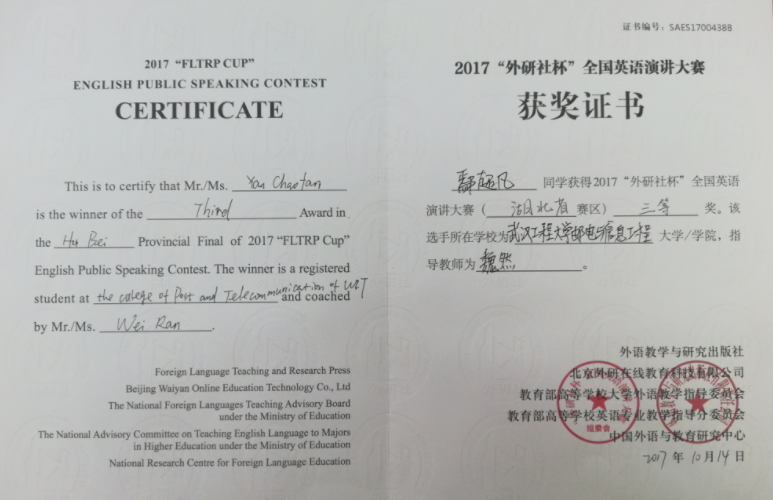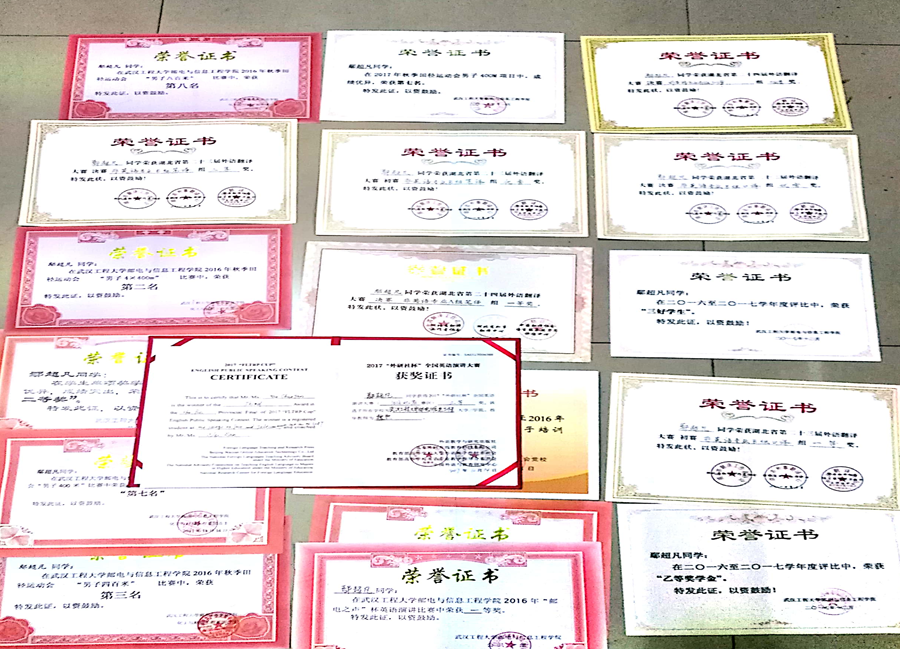 【English Talent】 鄢超凡,化工与材料工程系2015级化学工程与工艺01班学生。获湖北省第二十四届翻译大赛决赛非英语专业A组笔译一等奖及口译优秀奖、代表我院参加2017“外研社杯”全国英语演讲大赛获湖北省赛区三等奖、湖北省第二十三届翻译大赛非英专口译优秀奖及笔译三等奖。 ![]() ![]() 【Many Awards】 2016-2017学年评比获“乙等奖学金”及“三好学生”、2016“邮电之声”英语演讲比赛一等奖、“文韬杯”辩论赛团体一等奖;运动会获若干奖项。 ![]() 【Volunteer Activities】 鄢超凡同学积极参加了多项比赛及集体活动,曾是英语爱好者协会副会长,多次参加了大学生志愿者活动。 ![]() ![]() ![]() (责任编辑:admin) |