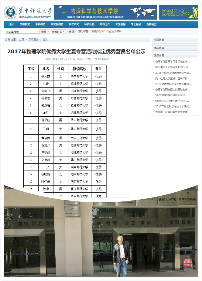 黄喆奥,湖北武汉人,入党积极分子,2014级药物制剂专业毕业生。曾担任班级学习委员,勤奋刻苦,积极上进,在校期间获得两次“丙等奖学金”。2017年暑期参加华中师范大学物理与技术学院举办的夏令营,并取得“优秀营员”称号。在2018年硕士研究生入学考试中取得总分322分(其中政治56,英语55,专业课一79,专业课二132)的成绩,现已被华中师范大学凝聚态物理专业录取。 ![]() 杨清银,湖北荆州人,2014级高分子材料与工程专业毕业生。在校期间积极参与各项活动,曾担任系学生会部长和勤工助理团秘书长,获得“积极分子”称号、“优秀学生干部”、“优秀学生助理”、“优秀共青团员”等多项荣誉。在学习上,勤奋好学,目标明确,多次获得各类校级奖学金。在2018年硕士研究生入学考试中取得总分388分(其中政治64,英语51,专业课一135,专业课二138)的成绩,现已被武汉工程大学高分子化学与物理专业录取。 ![]() 徐稳,湖北应城人,中共党员,2014级高分子材料专业毕业生。担任班级班长,品学兼优,在校期间连续三年获得“特等奖学金”、“三好学生标兵”、“优秀共青团员”等荣誉。曾在系部参加学工助理团工作,对待工作踏实负责,获得“优秀学工助理”。2016年加入中国共产党, 2017年被武汉工程大学评为“优秀共产党员”。在今年硕士研究生入学考试中取得总分261分(其中政治66,英语37,专业课一54,专业课二104)的成绩,现已被武汉工程大学高聚物结构与性能专业录取。 ![]() 邢茜茜,湖北广水人,中共党员,2014级药物制剂专业毕业生。在校期间曾担任班级团支书,勤奋刻苦,积极上进,连续三年获得“特等奖学金”、“三好学生标兵”、“优秀共青团干”、“优秀共青团员”及“优秀学员”等荣誉。在2018年硕士研究生入学考试中取得总分378分(其中政治56,英语55,专业课一121,专业课二146)的成绩,现已被武汉工程大学制药专业录取。 ![]() 徐天文,湖北仙桃人,中共预备党员,2014级化学工程与工艺专业毕业生。在校期间多方位发展,曾担任大学生宣传中心主任、数学建模协会会长,获得“国家奖学金”、“特等奖学金”、“三好学生标兵”、“优秀共青团干”、“优秀共青团员”及“全国大学生数学建模竞赛”湖北赛区“三等奖”等多项荣誉。在学习上,喜欢记笔记,善于思考。在2018年硕士研究生入学考试中取得总分325分(其中政治61,英语56,数学二77,专业课一131)的成绩,现已被武汉工程大学化学工程专业录取。 ![]() (责任编辑:admin) |