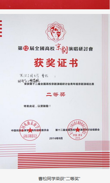 曹松 中共预备党员 化工与材料工程系2015级化学工程与工艺02班团支部书记,校京剧社荣誉社长。 【潜心钻研,传承国粹】 参加第十二届全国大学生京剧研讨会,经过激烈的角逐,表演的折子戏《四郎探母 坐宫》,受到了评委和观众的广泛好评,获国家二等奖。参加武汉市首届“戏曲秀”比赛,获铜奖。武汉市江夏杯第五届京剧票友艺术节大学生专场获“最佳表演奖”、武汉市第五届大学生艺术节获得戏曲组二等奖、2017年湖北省高校戏剧精品展演中荣获湖北省八大“校园戏曲之星”之一。 ![]() ![]() 【发挥作用,屡获嘉奖】 2016年化材系学生会“部门之星”、2016年五四评优 “校级优秀共青团干部”、.2016年双评 “乙等奖学金” “文体活动一等奖” 、2017年化材系“身边好榜样之文艺之星”、2017年五四评优 校级“优秀共青团员”“优秀共青团干部”、2017年10月 入选学院首批艺术人才库、2017年10月 入选学院党员督查团、2017年12月双评 “甲等奖学金” “文体活动一等奖” “三好学生”各类文艺晚会活动积极分子、各类敬老院活动积极分子。 ![]() ![]() 【媒体关注,送戏下乡】 在2018年寒假期间,参加“荆楚红色轻骑兵”黄冈市文联小分队演出。前往浠水县巴河镇邓家墩村、团风县团风镇江宇庙村、罗田县河铺镇牌形地村、蕲春县狮子镇长林村等地,为当地村民演出,获得一致好评。楚天都市报报道了以“高校京剧社社长寒假更忙 每天下乡去送戏”此次活动。 ![]() (责任编辑:admin) |