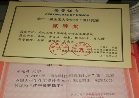 李俊怡——化工与材料工程系2016级化学工程与工艺01班学生,现任班级学习委员及学工处党员督查团团员。 李俊怡思想上追求进步,积极向党组织靠拢,于2018年12月4日成为一名中共预备党员。学习认真刻苦,成绩优良,2016-2017学年、2017-2018学年均获得“乙等奖学金”。积极参加各类社会活动,多次获得“优秀学生干部”、“三好学生”、“优秀共青团员”称号。 ![]() ![]() 2019年8月李俊怡做为主力队员,在系部向丽老师、康顺吉老师指导下,参赛项目《年产二十万吨醋酸乙烯酯项目》获得全国化工设计大赛二等奖。 ![]() 2019年第十三届全国大学生化工设计竞赛全国共有357所高校的2196支队伍报名参赛,最终全国共有343所学校1318支团队成功提交了作品。其中,华中赛区有来自湖北、河南、安徽和江西的54所高校145支本科生团队成功提交了作品,根据专家委员会对初赛作品的评分成绩,遴选进入华中赛区决赛的66支队伍。全国大学生化工设计竞赛选题关注化工、石化行业近期热点问题,重点解决关系国计民生的重要化工产品的生产,旨在对学生的化工知识综合运用能力、化工设计软件的应用能力和创新意识进行全方位考查,要求学生用Aspen Plus、3D Plant等众多仿真、模拟、设计、校核软件,贯穿“环保、节约、安全、实用、创新、实际与合理”的理念,具体包括厂区布置、车间设计、管道设计、自控设计、经济核算、可行性分析等近二十余项子项目。 (责任编辑:admin) |