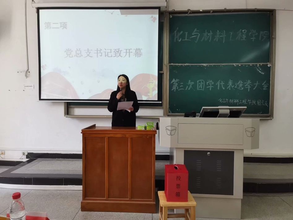 首先,党总支书记胡培代表化材学院致会议开幕词,她指出,此次大会既是对在座青年以及其他团员的一次教学,也是开创化材学院团学工作新局面的一次动员大会。并强调团学代表都是在听取各方面的意见以及经过严格的公正民主选举下产生的,是具有一定的代表性和号召性,是值得同学们相信与依赖的。同时胡培书记也对各位同学表达了自己的期望,希望他们能够不负众望,认真履行选举职责。