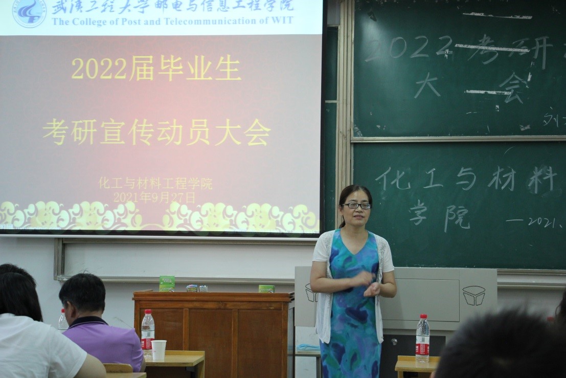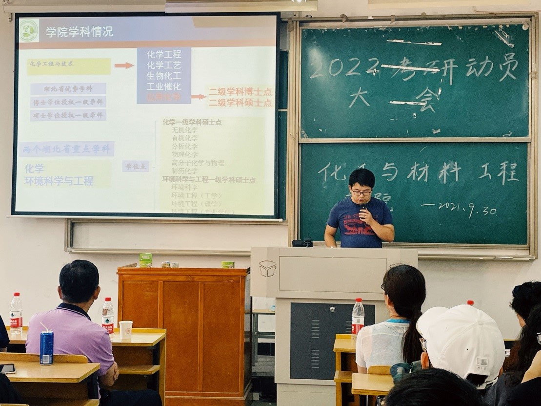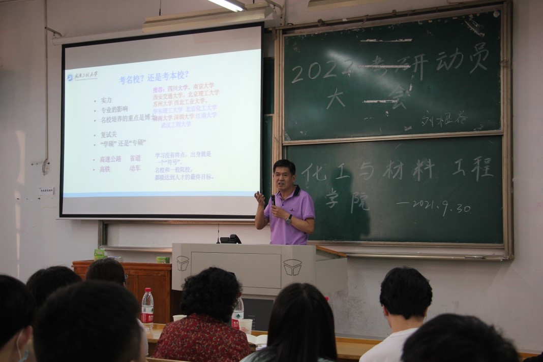 本次大会邀请了与化材学院的专业相关联的武汉工程大学四个学院的教授:武汉工程大学化学与环境工程学院张丽华教授、郭盛教授;材料科学与工程学院院长周爱军教授;化工与制药学院刘根炎教授;资源与安全工程学院、兴发矿业学院吝曼卿教授,他们亲临现场为同学们讲解2022年考研的新政策、新变化,营造了良好的考研、求职就业的氛围。