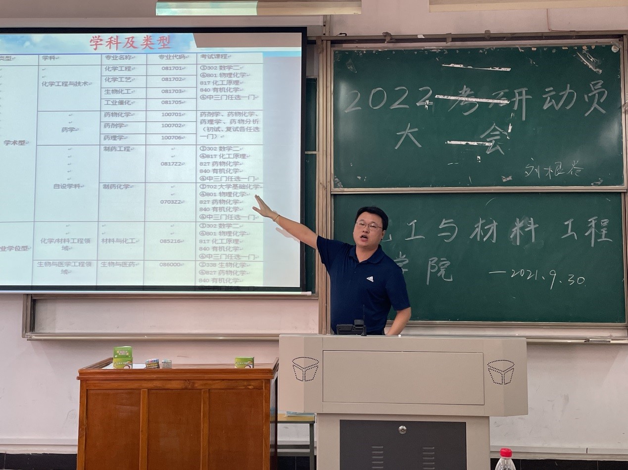 化工与制药学院刘根炎教授结合研究生优质的培养质量和良好的就业前景,向同学们阐明“考研”不仅是应对严峻就业形势下的有效自我提升途径,也是进一步提升个人职业能力、提高综合素质的重要方式。
