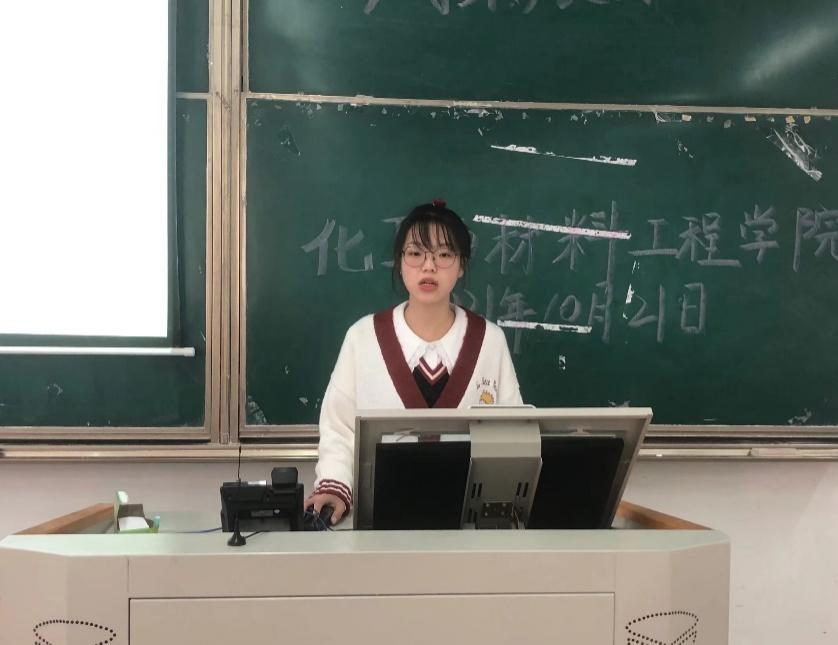 大会开始,由主持人介绍今天到场的评委,他们分别是:学工部副部长、院团委书记李晶晶老师、化材学院学工办主任、团总支书记郭咪咪老师、化材学院团总支学生会主席张梦阳同学、团总支副书记杨茂林同学、学工助理团团长吴飞同学、以及全体2021级学生。