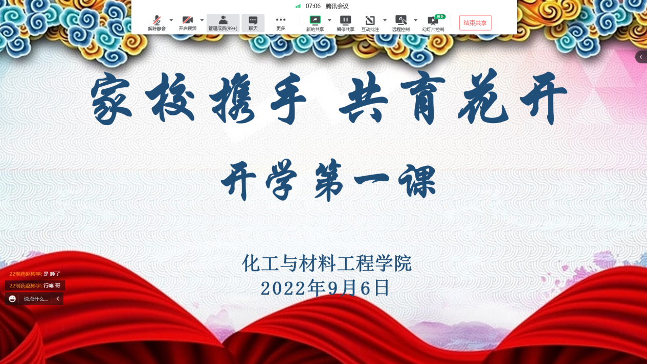 (通讯员:彭晶)结合疫情防控和学院工作实际,2022年9月6日,2022级化材学院师生共聚云端,举办“家校携手 共育花开”新生开学第一课活动。学院党总支书记胡培、副书记彭晶、22级年级组长郭咪咪、22级全体班主任及全体新生200多名师生参加了新生开学第一课。![]() “第一课”干货满满,内容充实。胡培书记详细介绍了化材永利概况、学科设置、师资队伍以及近几年来学院的育人成果等基本情况,使新生对学院的情况有了全面认知和认同,她希望同学们利用好我院师资优势和学科优势,学好专业本领,为考研升学和成为各领域的工程技术人才打好坚实的基础。 ![]() ![]() 彭晶副书记对学校校纪校规、“五防”安全教育等做出讲解,强调了疫情防控、校园安全等相关事项。通过列举发生在身边的电信诈骗案例,对22级新生进行安全警示教育,要求国家反诈APP全覆盖,提醒大家防患于未然。 ![]() ![]() 22级新生辅导员郭咪咪老师对疫情防控、新生返校要求做详细解读,同时介绍了22级新生班主任情况,并寄语同学们要树立理想信念,丰富大学生活,不断完善目标与计划,顺利完成过渡。 ![]() (责任编辑:admin) |