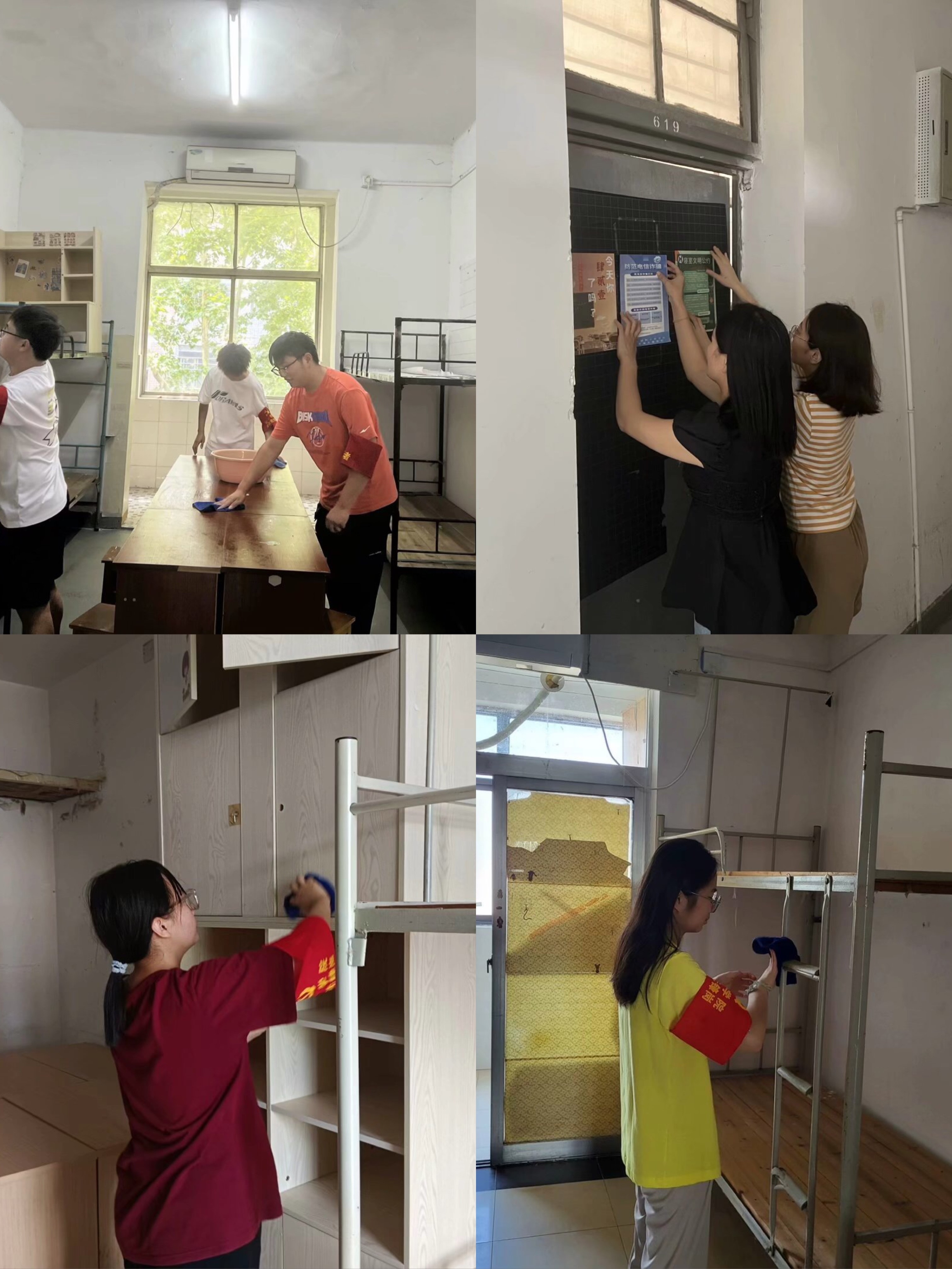 欧阳院长对穿新生床位逐一检查,给出具体指导意见。同时带领全体党员师生井然有序地对所有新生宿舍门窗、天花板、地面、床架、储物柜、阳台等区域进行了彻底清洁和整理,经过近2个多小时的整理和打扫,宿舍面貌焕然一新。