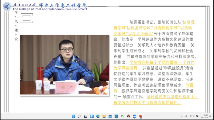 (通讯员:孙泽)为加强学院学风建设,营造良好的学习氛围,304永利集团于2022年3月3日19:00,学院召开了2021-2022学年度春季学期学风建设线上分享会。学院学工办主任郭咪咪老师、各班级分享人及各年级学生参加了此次会议。